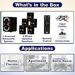 BLUETOOTH 5.1 HOME THEATER SPEAKER SYSTEM – Stream music from your phone to the built in Bluetooth receiver, integrated power amp with 600 watts system power, Pro Surround function converts stereo to 5.1 sound, LED illuminated sub with multi color and pattern flashing light display