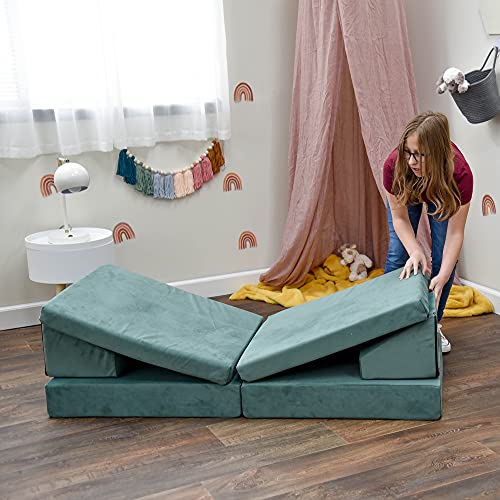 6-PIECE DESIGN: This teal sofa has 2 back rests, 2 bottom pieces, and 2 top pieces. Bottom pieces feature dense foam to ensure the sofa will endure wear and tear. Top pieces are made from a softer foam so kids are able to snuggle into their new couch.