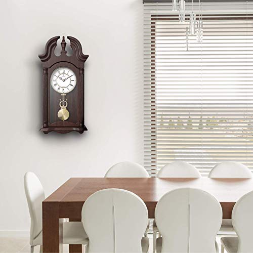 ELEGANT. CLASSIC. VINTAGE. Get ready to fall in love with our premium Verona Wooden Pendulum Clock! Our beautiful and elegant wood clock is made with real wood, decorative carved design, rich dark brown finish, white analogue dial, gold accents and a glass front; With a slim and rectangular design, our clock adds style and character to any home or office.